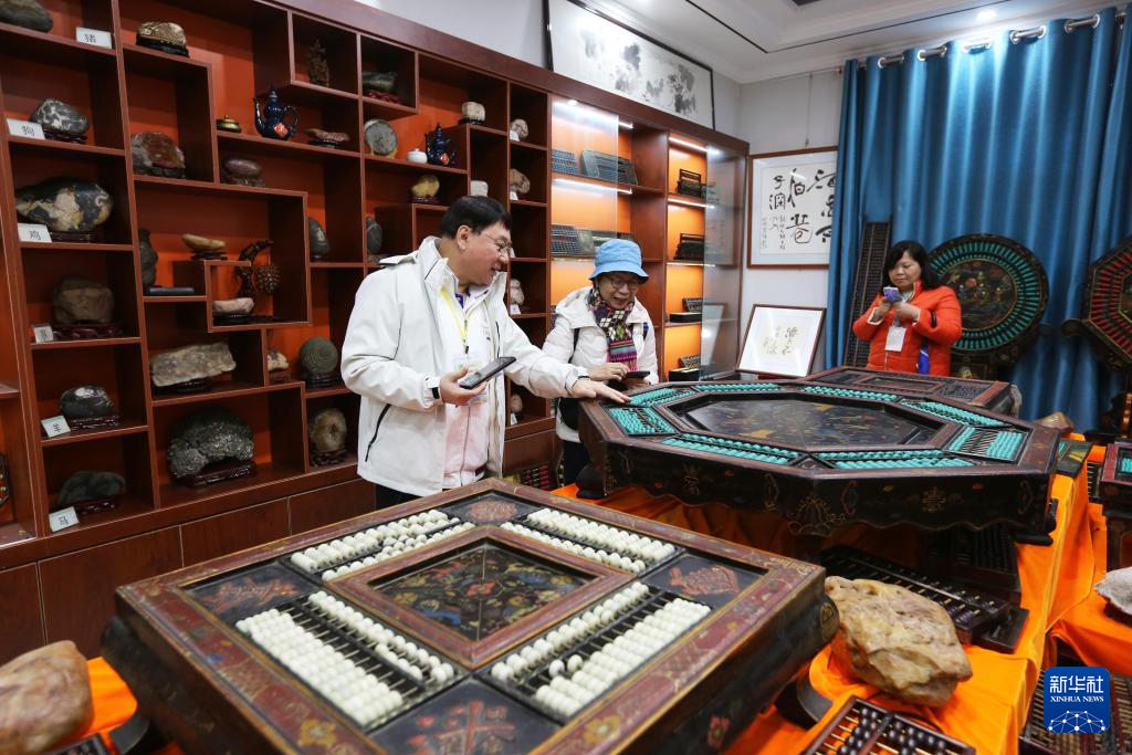 10月14日,游客在程万里的算盘非遗体验基地观看各种算盘。