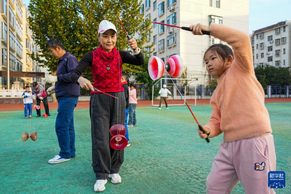 10月22日,志愿者在淄博市博山区中心路小学为学生们传授抖空竹。