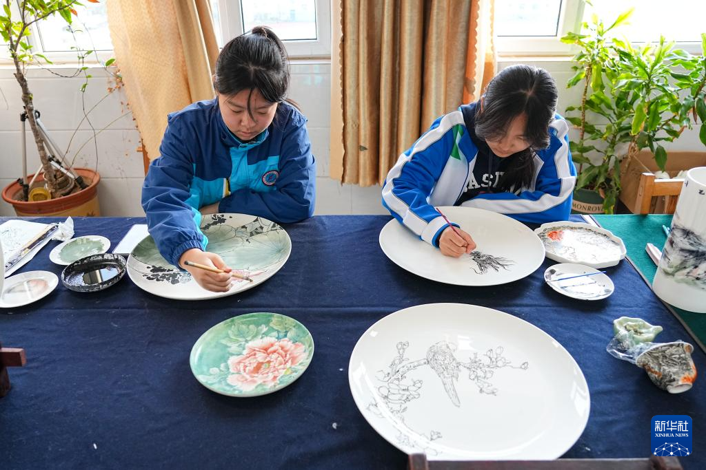 10月22日,淄博市博山第六中学学生在创作陶瓷彩绘。