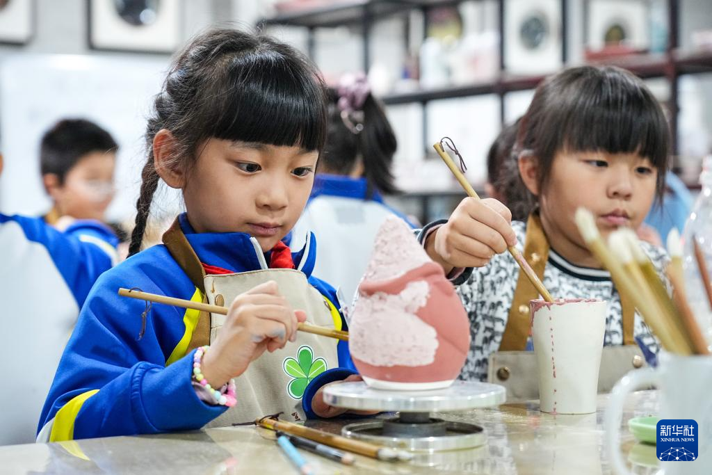 10月22日,淄博市博山区中心路小学学生在学习陶瓷制作技艺。