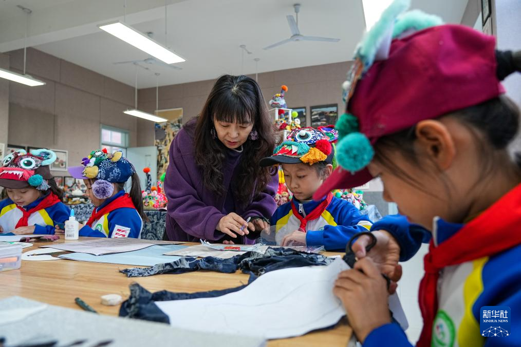 10月22日,淄博市博山区四十亩地小学教师韩晓英在辅导学生创作布贴画。